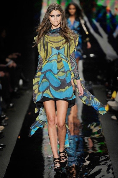 2010: Nathan Jenden kreatív igazgató bemutatója élénk színű selyemruhákkal.